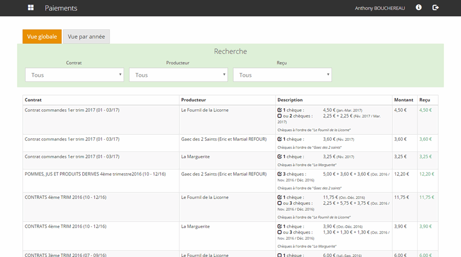 Les comptes "producteurs" accèdent uniquement aux comptes-rendus des contrats (par date, par adhérent...)